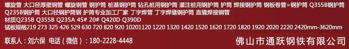 佛山市通躍鋼鐵有限公司擁有多條美國(guó)先進(jìn)的螺旋鋼管生產(chǎn)線(xiàn),生產(chǎn)直徑φ159-φ3620mm(壁厚6mm-20mm)的雙面埋弧螺旋焊鋼管,年生產(chǎn)能力15萬(wàn)噸。生產(chǎn)螺旋管 螺旋鋼管 螺旋焊管 規(guī)格厚度6mm-20mm 直徑159mm—3620mm 有多條鋼板卷管機(jī)生產(chǎn)規(guī)格厚度6mm-70mm 直徑400mm-5020mm 螺旋管 大口徑厚壁鋼管 螺旋鋼管 鋼護(hù)筒 樁基鋼護(hù)筒 鉆孔樁用鋼護(hù)筒 灌注樁用鋼護(hù)筒 護(hù)筒 焊接鋼護(hù)筒 鋼板卷管=鋼護(hù)筒 Q355B鋼護(hù)筒 Q235B鋼護(hù)筒 大口徑鋼護(hù)筒鋼 護(hù)筒專(zhuān)業(yè)加工廠(chǎng)家 丁字焊管 丁字焊縫鋼護(hù)筒 直縫焊接鋼管材質(zhì)Q235B Q355B Q235A 45# 20# Q420D Q390D 錳板規(guī)格219 273 325 426 529 630 720 820 920 1020 1120 1220 1320 1420 1520 1620 1720 1820 1920 2020 2220 2420mm-3620mm。手機(jī):180-2228-4448